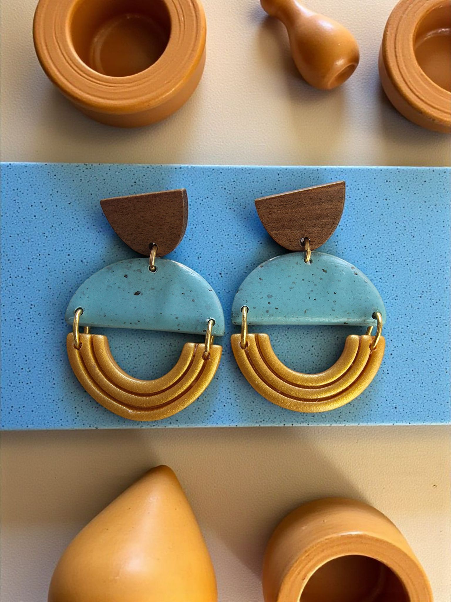 Alejandra earrings blend vibrant turquoise and shimmering gold tones crafted from lightweight polymer clay, ensuring comfort for all-day wear. These earrings add a touch of elegance and color to any outfit without weighing you down, perfect for those who want style and comfort together.