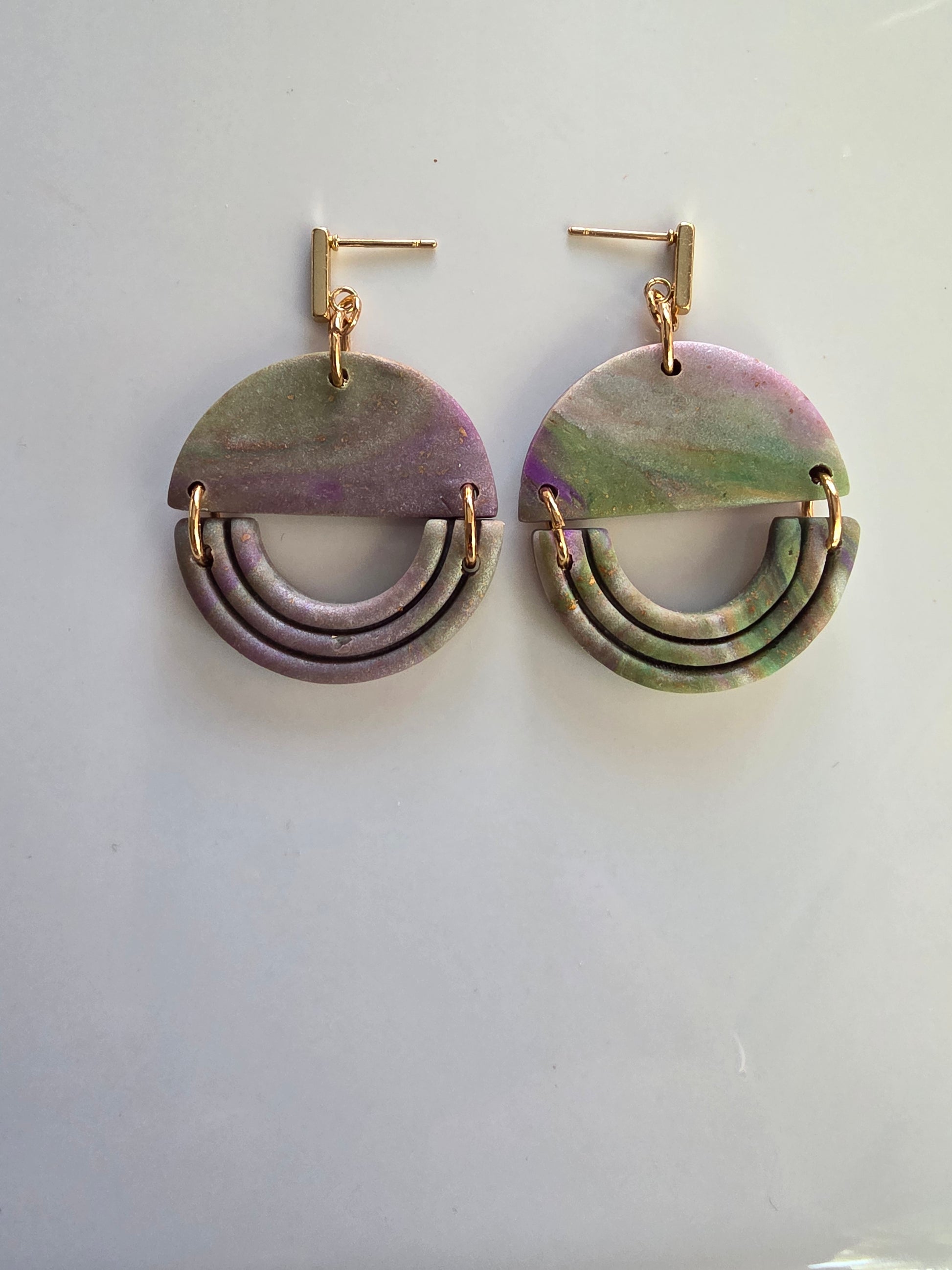 Alejandra earrings blend purple and shimmering gold tones crafted from lightweight polymer clay, ensuring comfort for all-day wear. These earrings add a touch of elegance and color to any outfit without weighing you down, perfect for those who want style and comfort together.