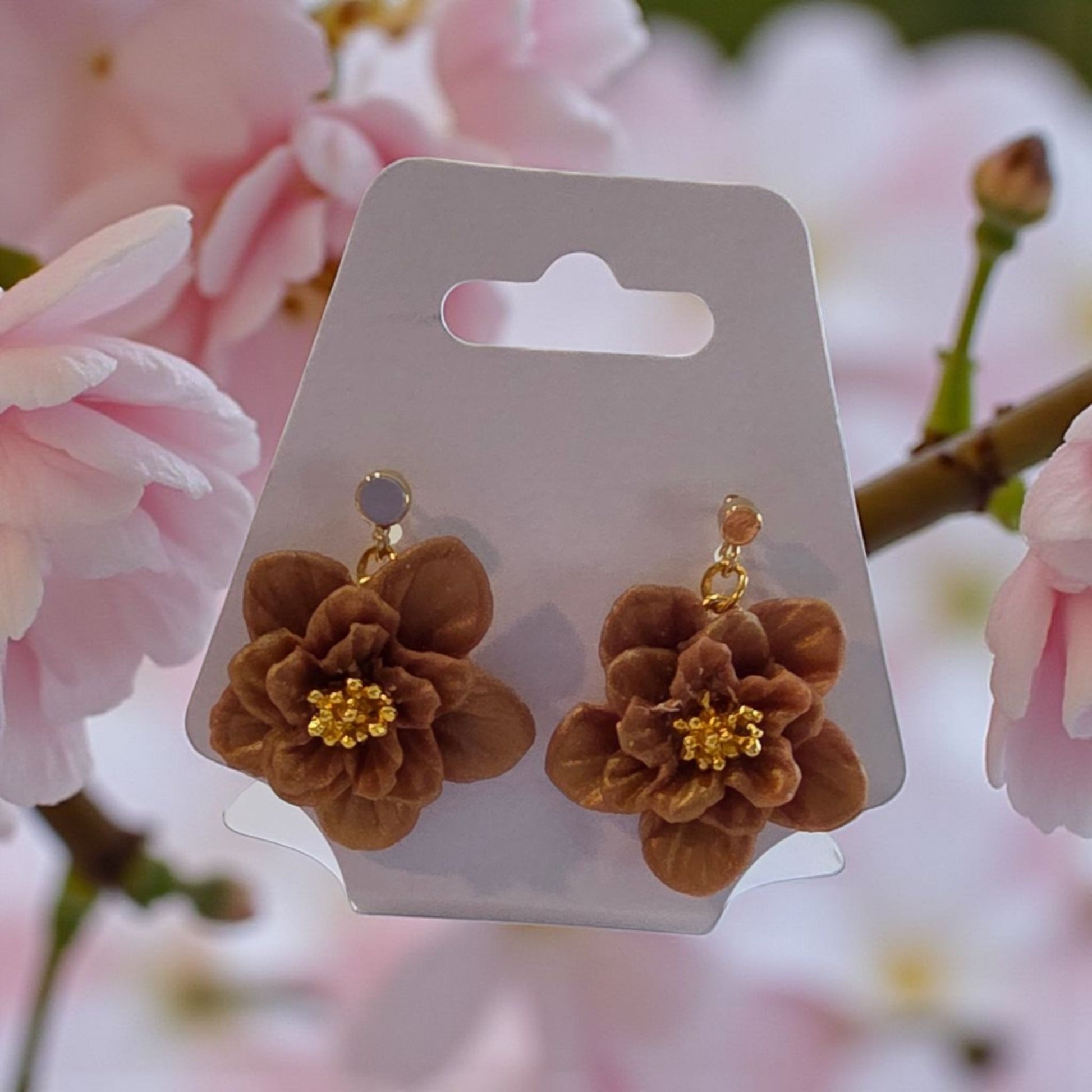 Hand-sculpted polymer clay flower adorned with warm golden details. Ana brings a whimsical, botanical touch to your jewelry collection. Hypoallergenic and crafted to celebrate individuality—wear a one-of-a-kind piece that's as unique as you are.