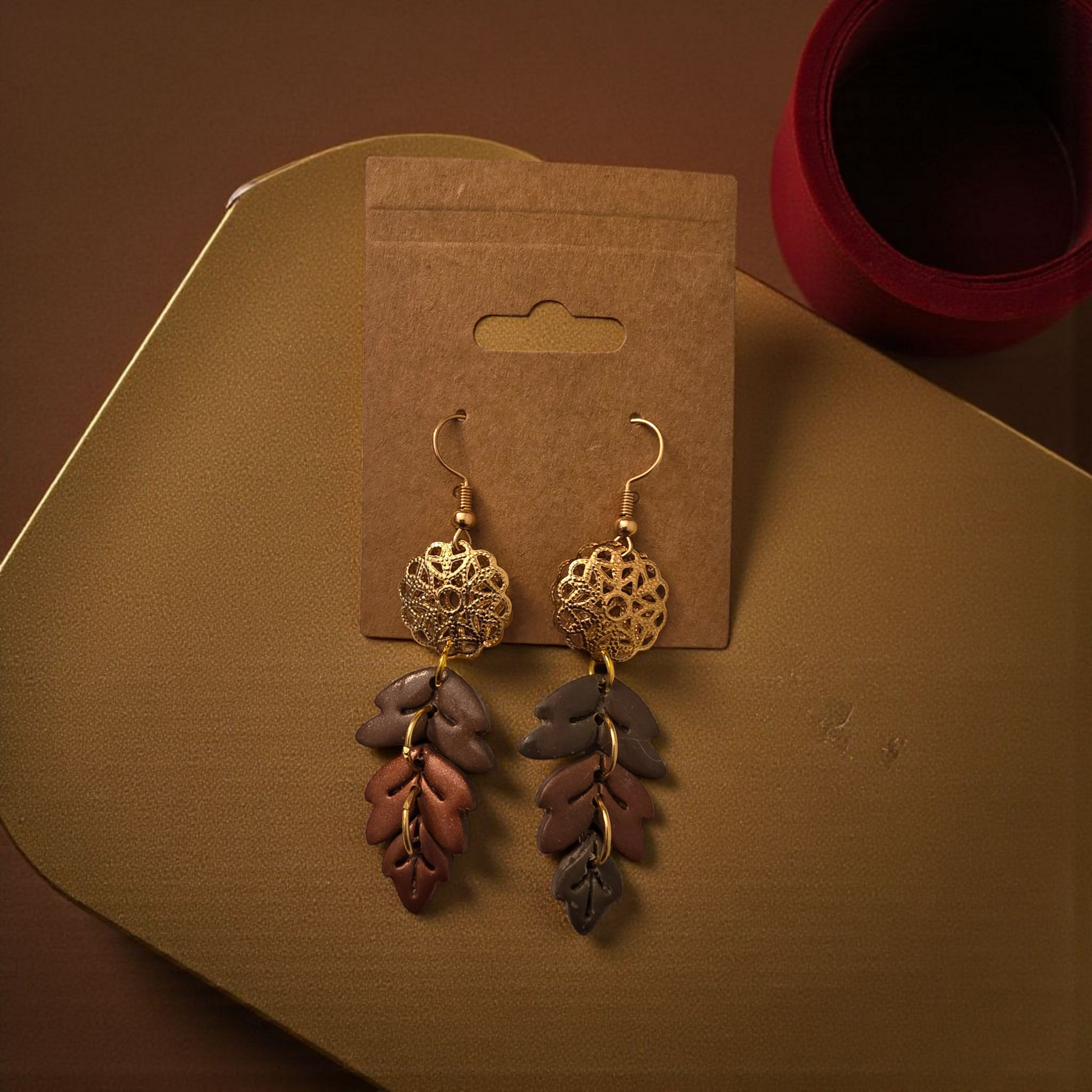 Mila earrings showcase handcrafted polymer clay in warm copper and green tones, inspired by the rich hues of fall. Lightweight and hypoallergenic, these elegant dangles combine artisanal charm with everyday comfort.