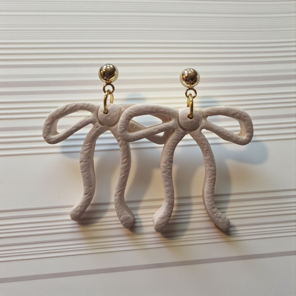 Delicate white ribbon-inspired earrings handcrafted from hypoallergenic polymer clay. Perfect for sensitive ears, these lightweight pieces add a touch of elegance to any look.